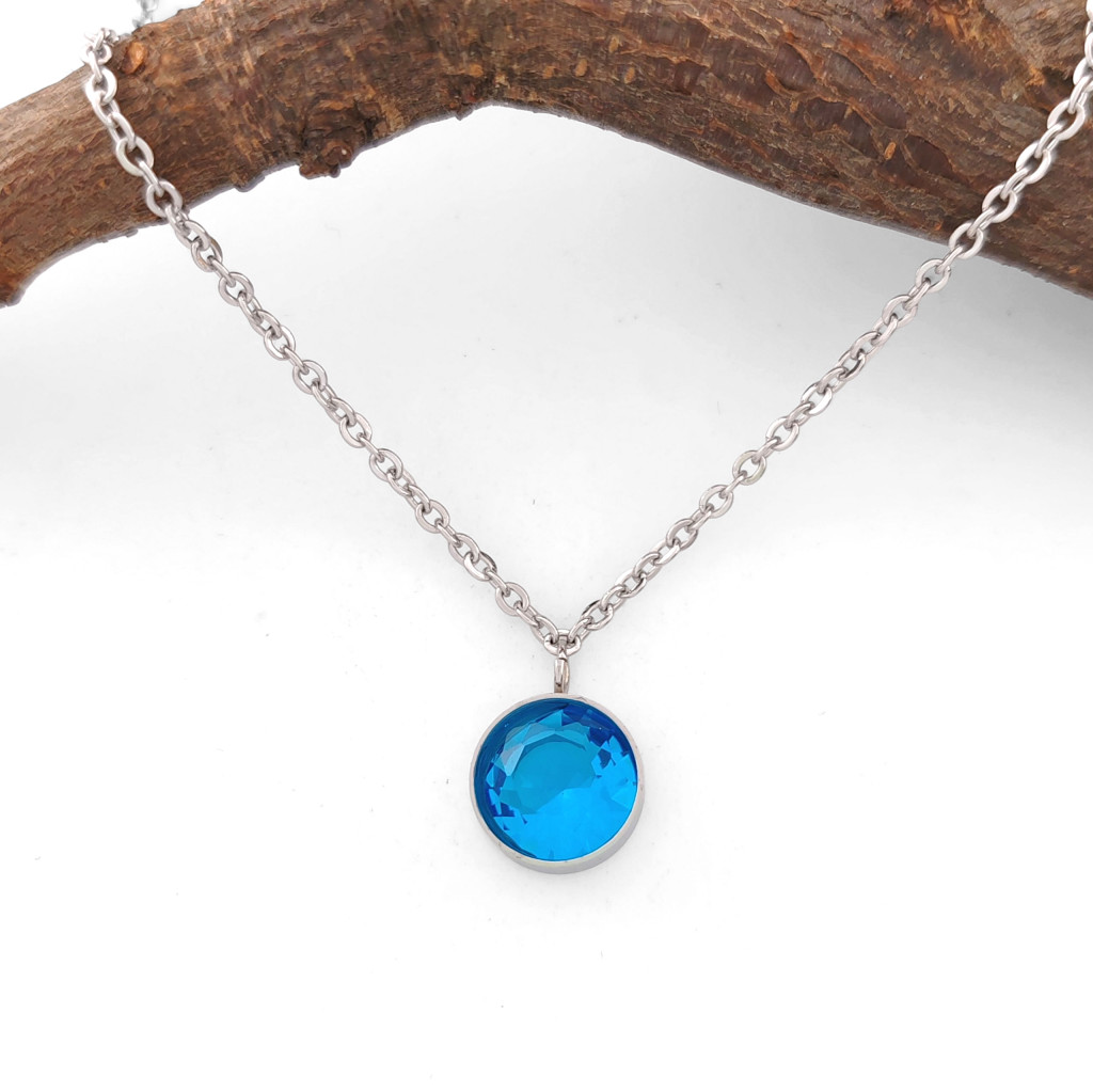 Gyönyörű, ezüstszínű kerek medál, amely csillogó égszínkék cirkónia kristállyal van díszítve, melyet karmos foglalat tart biztonságosan a helyén.
