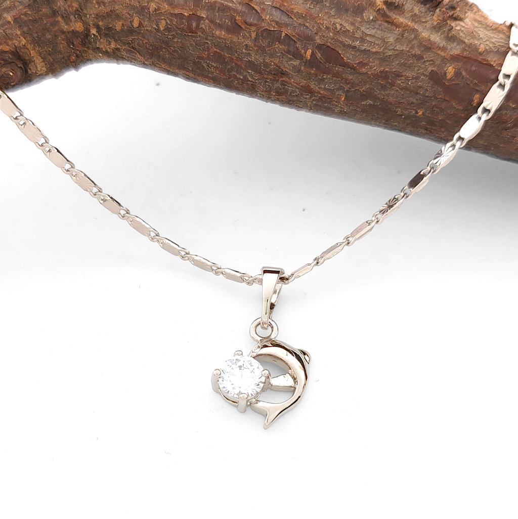 Gyönyörű, ezüstszínű delfin medál, amely csillogó fehér cirkónia kristállyal van díszítve. A kristály karmos foglalatban helyezkedik el.