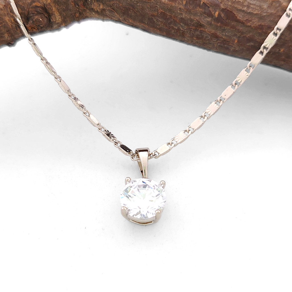 Gyönyörű,  ezüstszínű medál, amely csillogó fehér cirkónia kristállyal van díszítve. A kristály karmos foglalatban helyezkedik el.