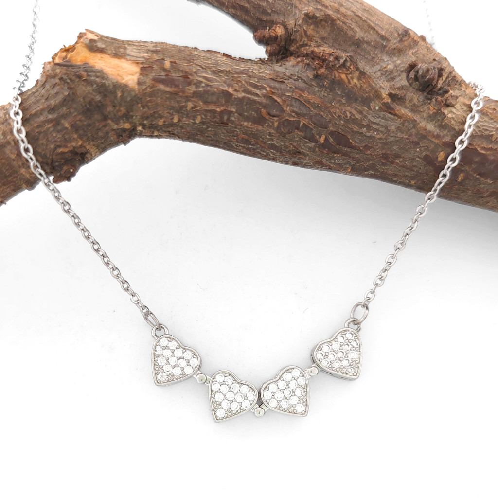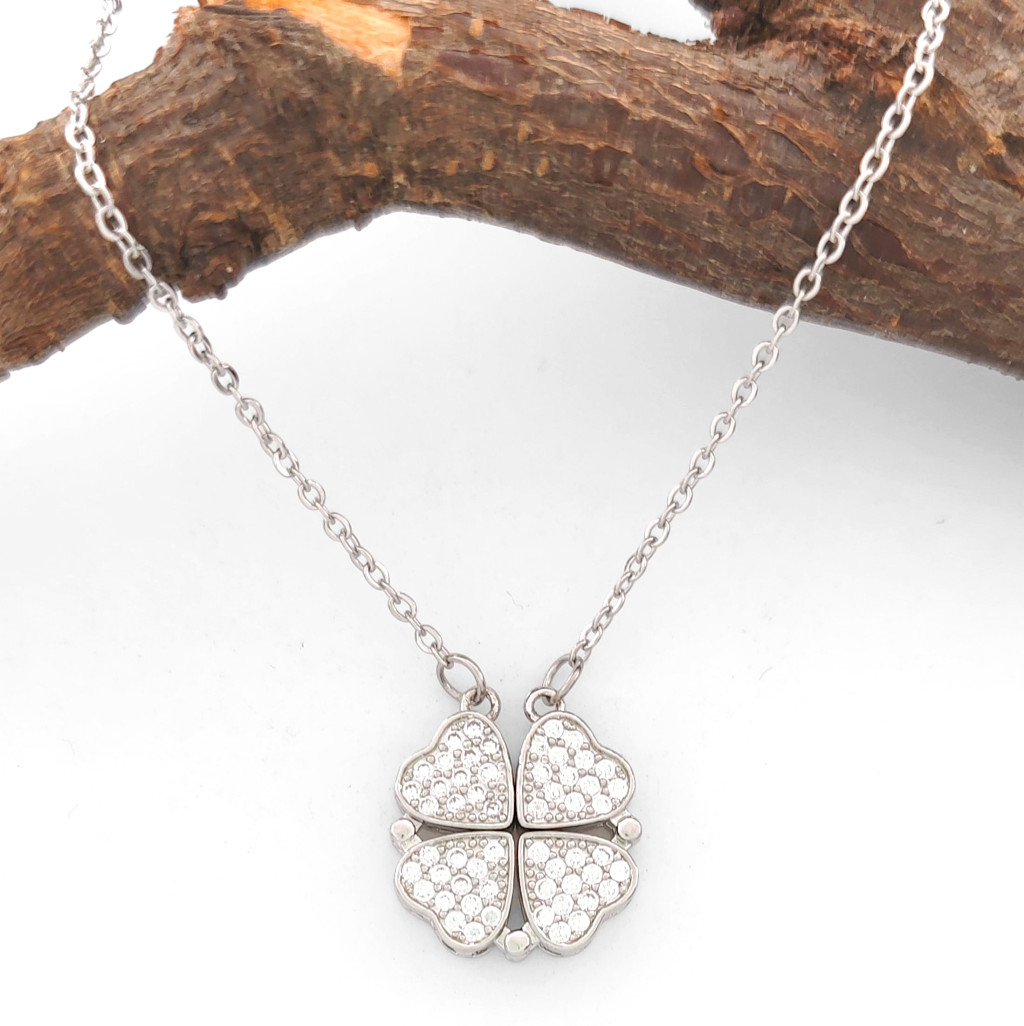 Gyönyörű, ezüstszínű lóhere medál, amely csillogó fehér cirkónia kristállyal van díszítve, melyeket karmos foglalat tart biztonságosan a helyükön. A medál kinyitva négy szívet formáz.