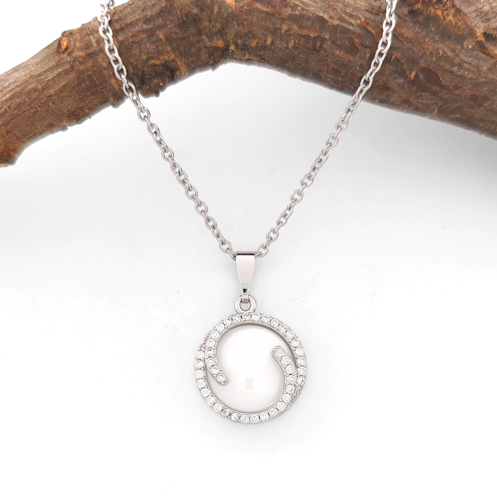 Gyönyörű, fehér kerámia-nemesacél medál, amely csillogó fehér cirkónia kristállyal van díszítve, melyeket karmos, ragasztott, peremezett foglalat tart biztonságosan a helyükön.