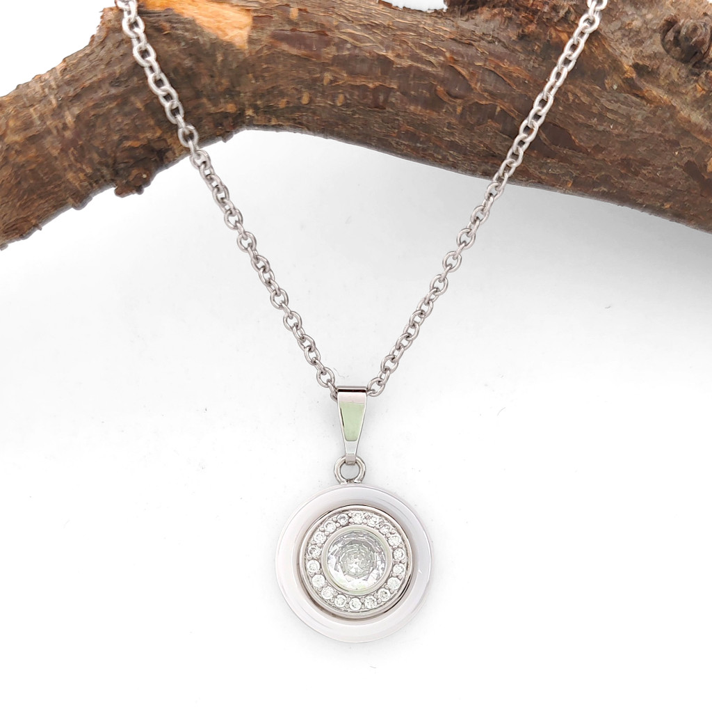 Gyönyörű, ezüstszínű fehér kerámia-nemesacél medál, amely csillogó fehér cirkónia kristállyal van díszítve, melyeket karmos, ragasztott, peremezett foglalat tart biztonságosan a helyükön.