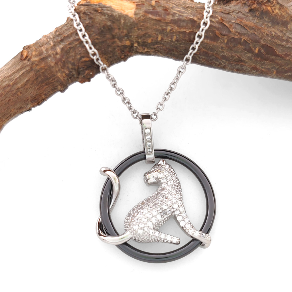 Gyönyörű, fekete kerámia-nemesacél párduc medál, amely csillogó fehér cirkónia kristállyal van díszítve, melyeket karmos foglalat tart biztonságosan a helyükön.