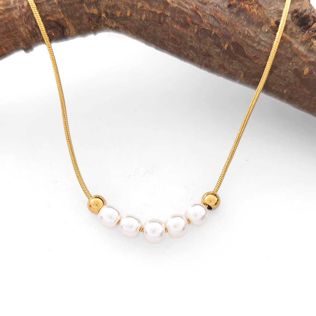 Delila aranyszínű nemesacél nyaklánc fehér gyöngyökkel