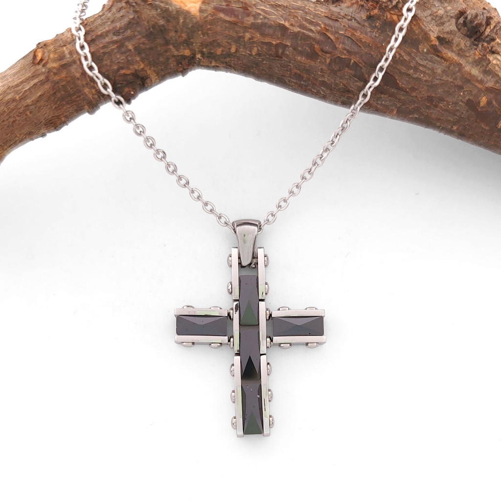 Gyönyörű, fekete kerámia-nemesacél kereszt medál, ezüstszínű nemesacél nyaklánccal.