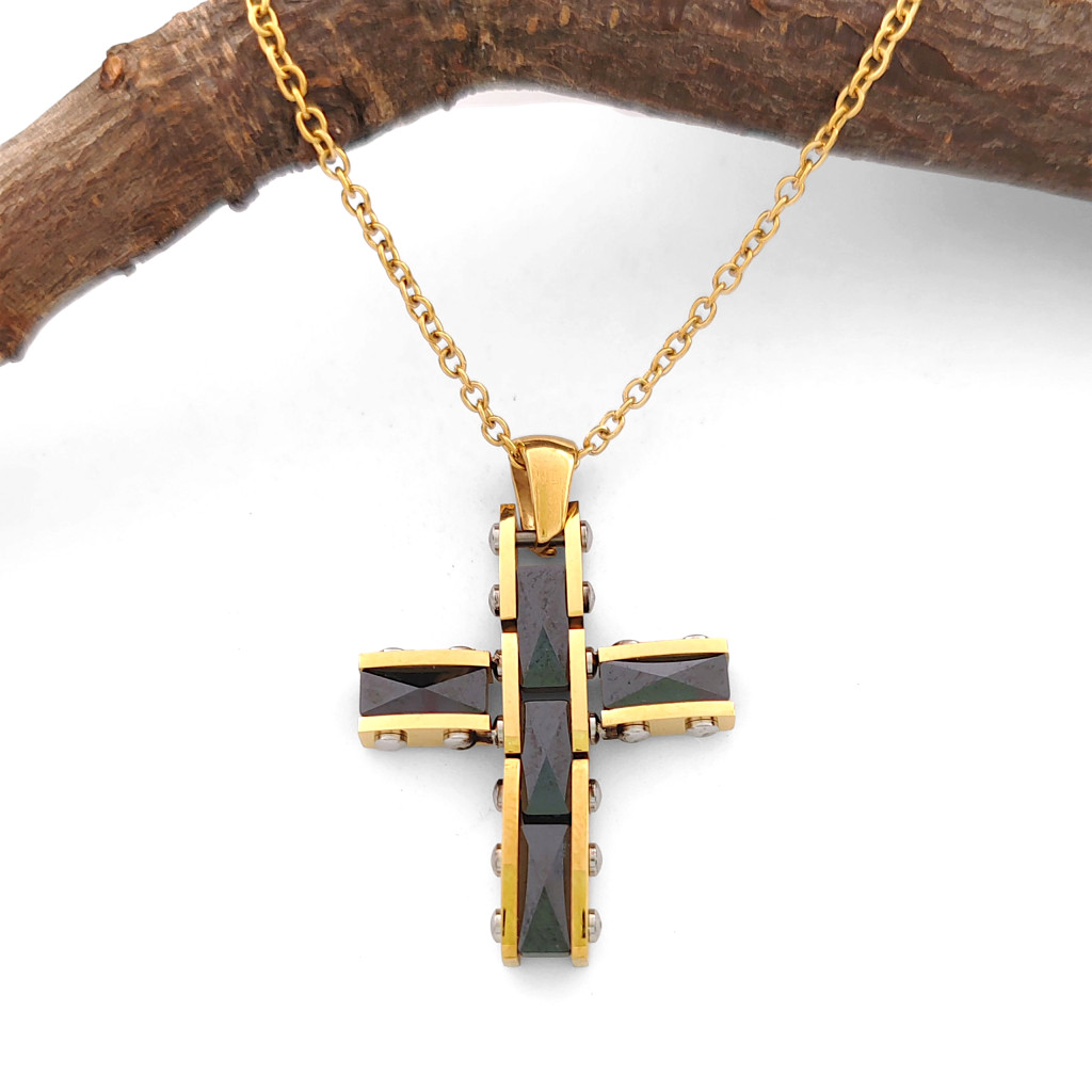Gyönyörű, fekete kerámia-nemesacél kereszt medál, aranyszínű nemesacél nyaklánccal.