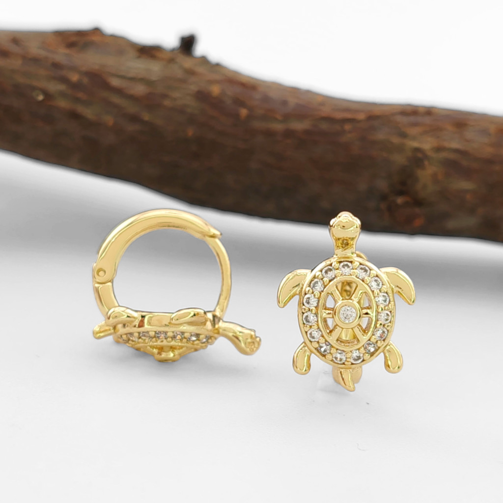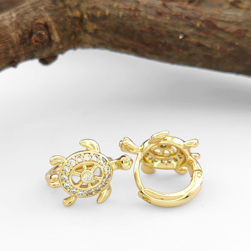 Ez az aranyszínű karika fülbevaló a finom elegancia és a ragyogás tökéletes kombinációja. A teknős minta és a csillogó fehér cirkónia kristályok különleges látványt nyújtanak, melyeket karmos foglalat tart biztonságosan a helyükön. A fülbevaló minden egyes kristálya ragyogással tölti meg a megjelenést.