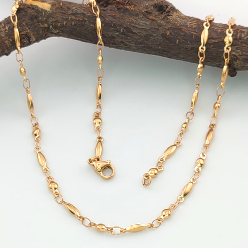 Ez az aranyszínű nyaklánc egy igazán elegáns és időtálló ékszer, amely minden alkalomra tökéletes választás. A gömb és hosszított szemek finoman megmunkált mintája eleganciát sugároz, miközben a finom aranyszín ragyogása minden ruhadarabbal könnyedén kombinálható.