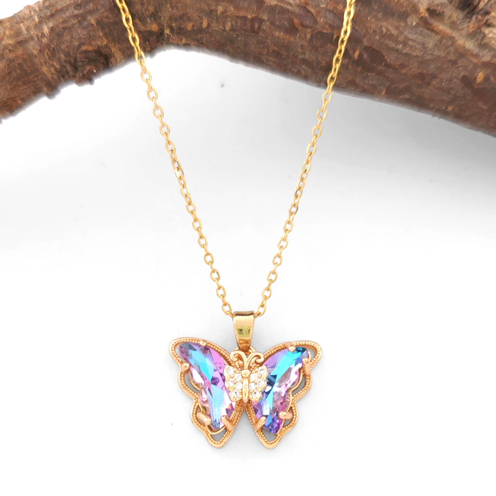 Gyönyörű, aranyszínű pillangó medál, amely csillogó lilás-kék és fehér cirkónia kristályokkal van díszítve. A kristályokat karmos foglalat tartja biztonságosan a helyén.