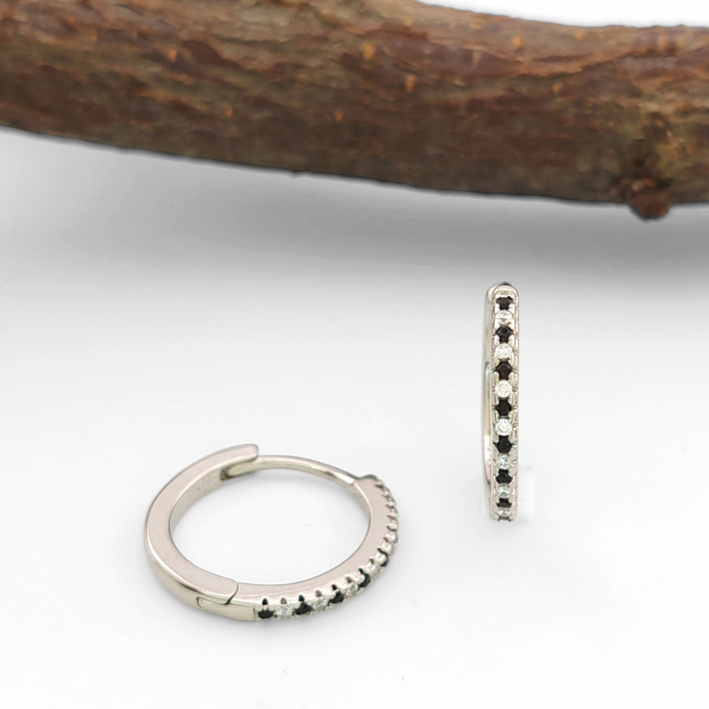 Ez az ezüstszínű fülbevaló a finom elegancia és a ragyogás tökéletes kombinációja. A csillogó fehér és fekete cirkónia kristályok különleges látványt nyújtanak, melyeket karmos foglalat tart biztonságosan a helyükön. A fülbevaló minden egyes kristálya ragyogással tölti meg a megjelenést.