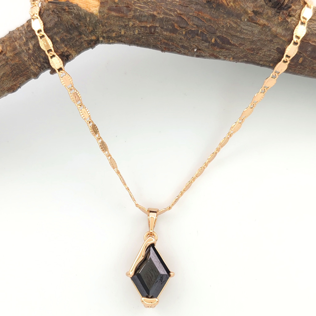 Gyönyörű, aranyszínű medál, amely csillogó fekete cirkónia kristállyal van díszítve. A kristály karmos foglalatban helyezkedik el.