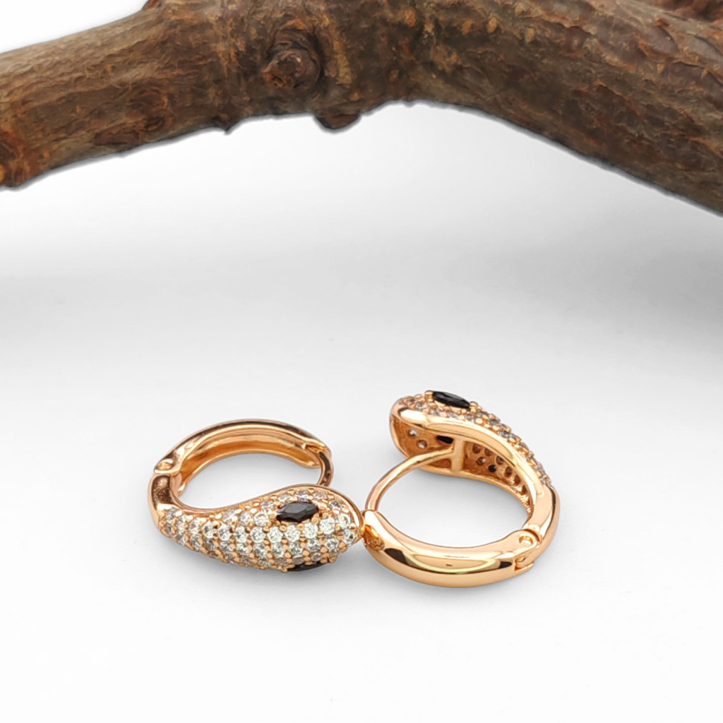 Ez az aranyszínű fülbevaló a finom elegancia és a ragyogás tökéletes kombinációja. A kígyó motívum és a csillogó fehér és fekete cirkónia kristályok különleges látványt nyújtanak, melyeket karmos foglalat tart biztonságosan a helyükön. A fülbevaló minden egyes kristálya ragyogással tölti meg a megjelenést.