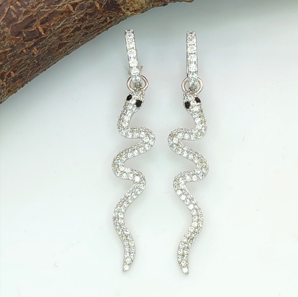 Vagány és időtlen dizájn, melyet ragyogó, fehér cirkónia kristályok és kígyó motívum tesznek igazán különlegessé. A kristályok biztonságos, karmos foglalatban helyezkednek el, így garantált a tartós csillogás. A függő levehető a karikáról, így két külön fülbevalóként is viselhető.